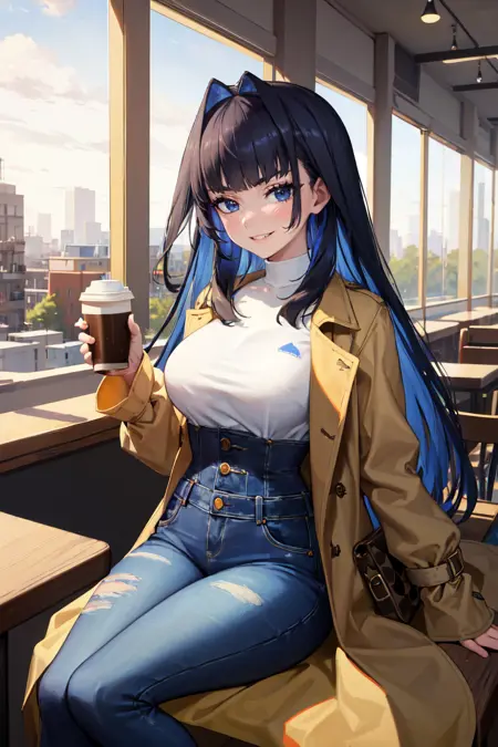 "KroniiCasual, long hair, hair intakes, turtleneck, brown coat, jeans"