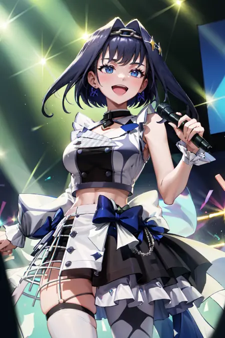 "KroniiIdol, short hair, hair intakes, chain, bow intakes, hololive idol uniform, idol clothes, single thighhighs, wrist cuffs, midriff"