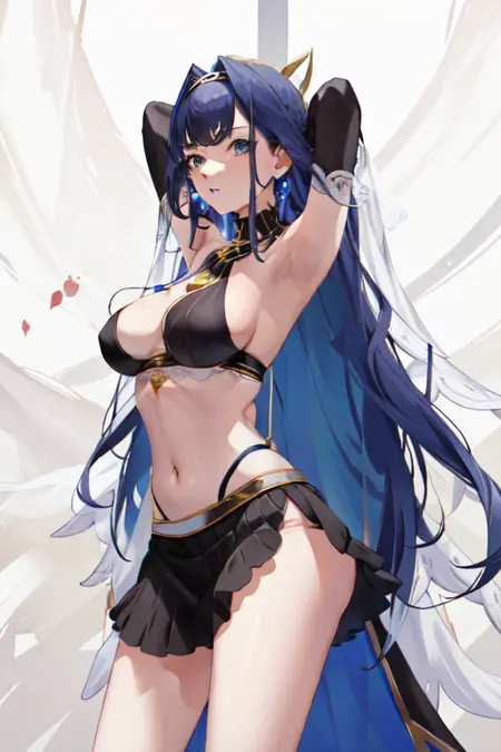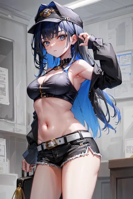 "KroniiBase, 짧은 머리, 머리 끝 부분, 체인, 베일, 리본 귀걸이, 줄무늬 탑, 흰색 조끼, 파란 리본, 검은 치마, 분리형 소매, 검은 장갑, 검은 허벅지 장식"