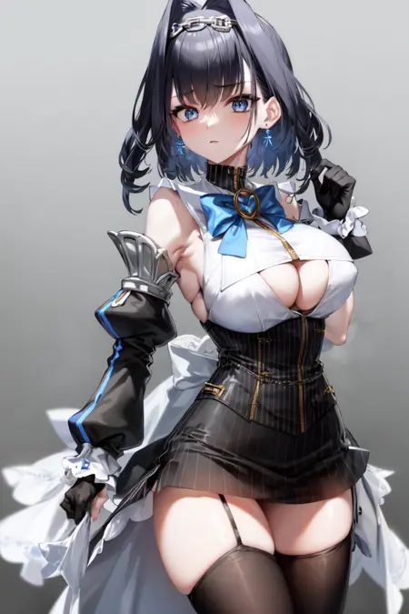 Ouro Kronii, 1girl, solo, 흉상, 짧은 머리, 치마, 셔츠, 허벅지 장식, 장갑, 긴 소매, 리본, 절개선, 어깨 노출, 장신구, 흰색 셔츠, 귀걸이, 분리형 소매, 소매 없는, 검은 장갑, 줄무늬, 패딩 소매, 검은 허벅지 장식, 미니스커트, 검은 치마, 리본 넥타이, 옷 자국, 소매 없는 셔츠, 체인, 파란 리본, 절개 선, 세로 줄무늬, 지퍼, 비대칭 다리 장식, 줄무늬 치마, 머리 체인, 리본 귀걸이