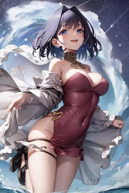 "KroniiIdol, 짧은 머리, 머리 끝 부분, 체인, 리본 장식, 홀로라이브 아이돌 유니폼, 아이돌 의상, 단일 허벅지 장식, 팔목 팔찌, 복부 노출"