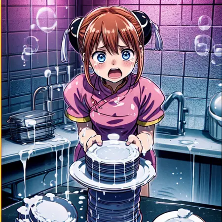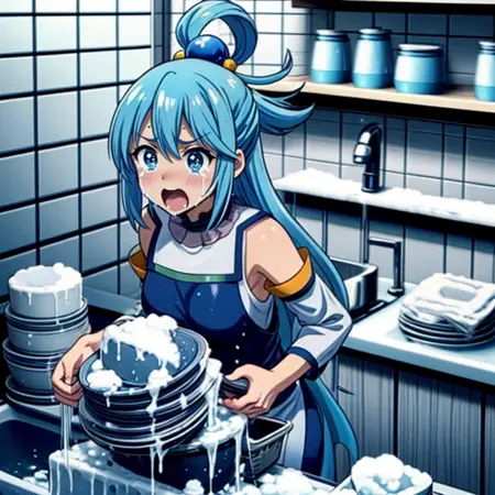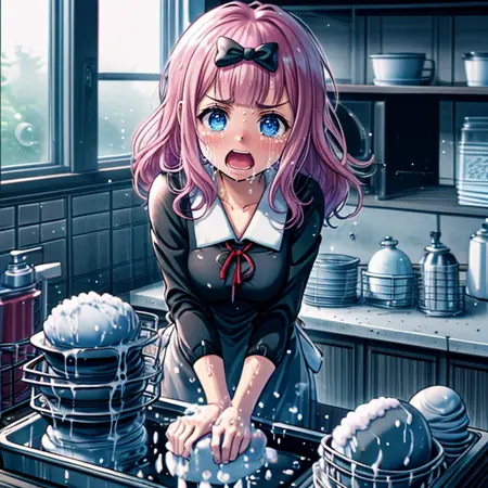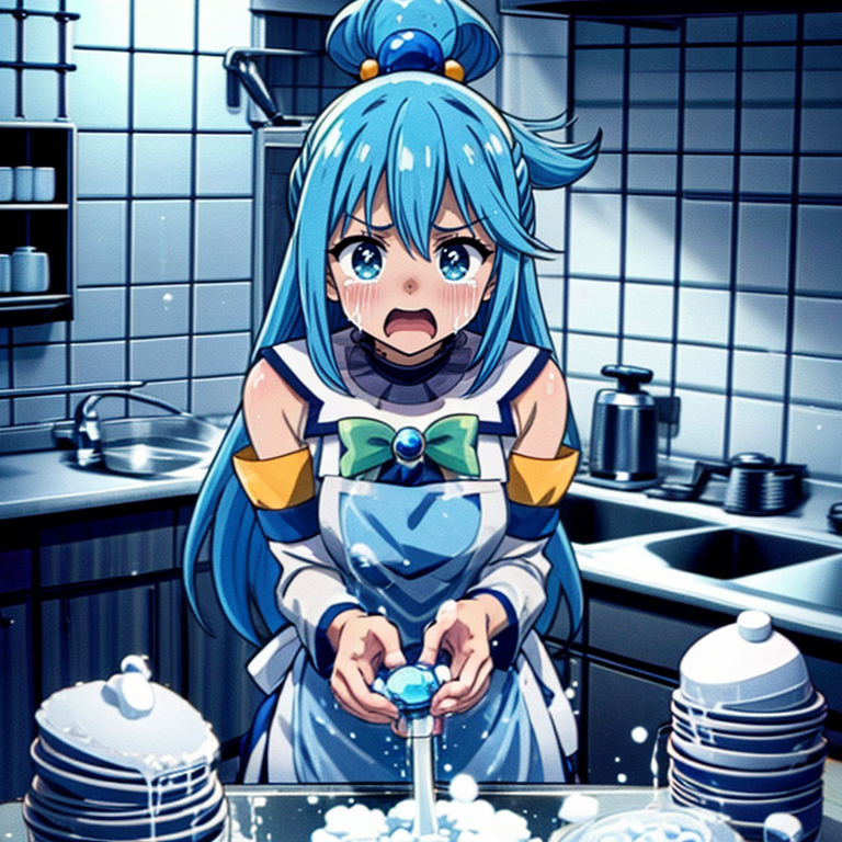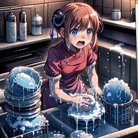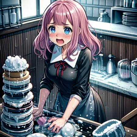 I've created a LoRa scene of someone crying and screaming while washing dishes. It's set in a kitchen-like area with a large stack of dishes being washed amid tears and screams. While expressions can be altered, the number of dishes cannot be changed. The image also contains a lot of foam due to the source material used. A strength of 0.4 is optimal for this scene.