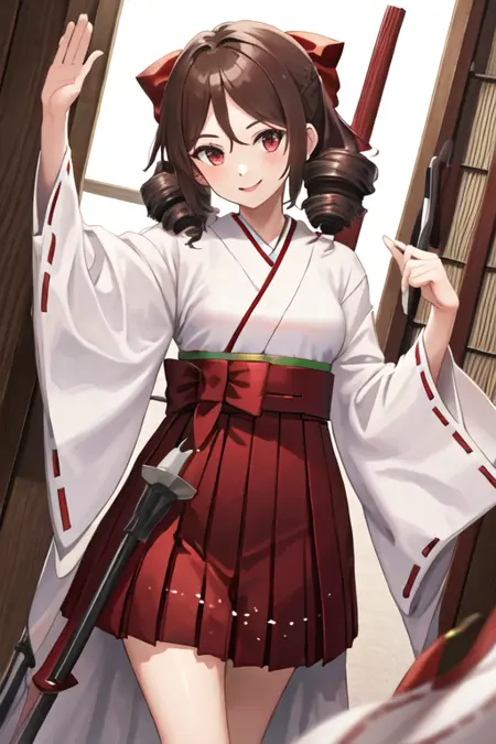 触发词为 harukaze_kantaicollection,推荐标签为:best quality, masterpiece, highres, solo, {harukaze_kantaicollection:1.15}, brown_hair, drill_hair, twin_drills, red_eyes, bow, hair_bow, red_bow, long_hair, smile, breasts。