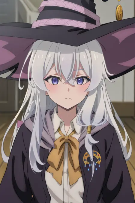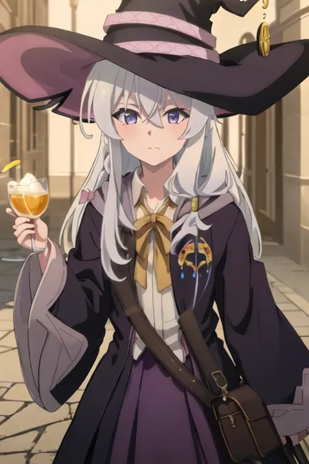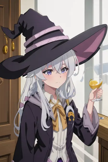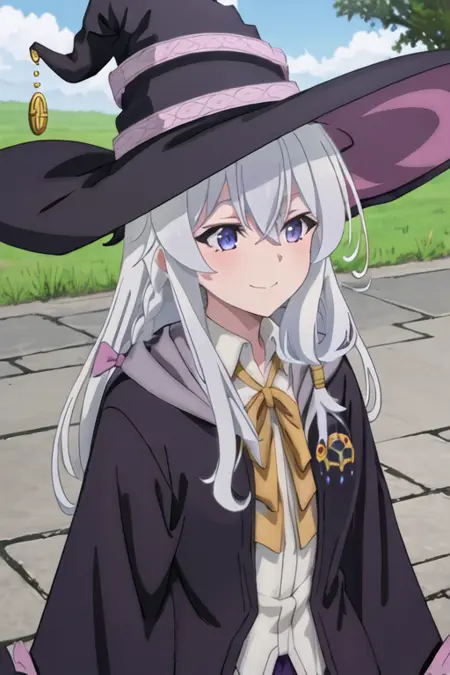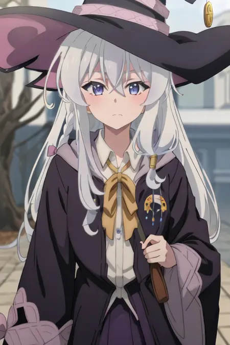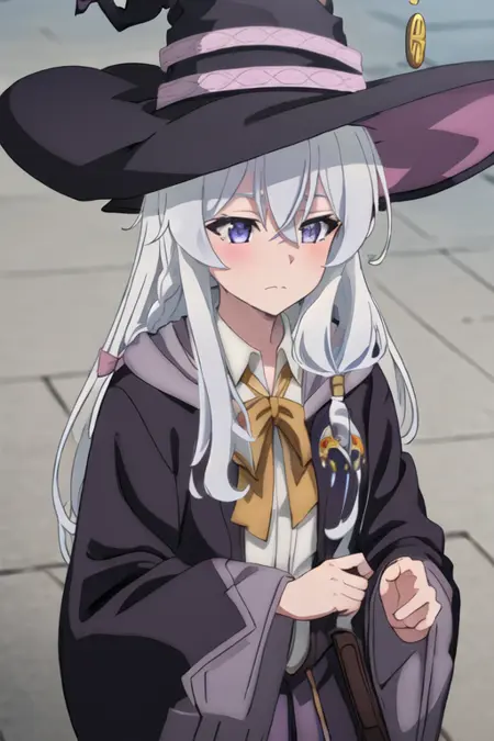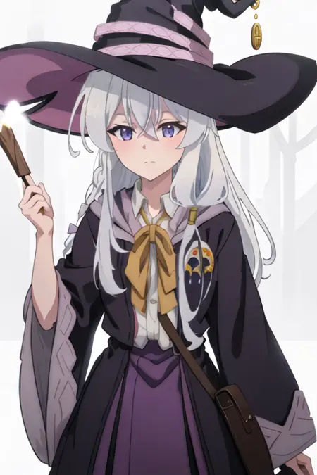 The trigger word is elaina_majonotabitabi, and the recommended tags are best quality, masterpiece, highres, solo, {elaina_majonotabitabi:1.15}, long_hair, bangs, hair_between_eyes, blue_eyes, closed_mouth, grey_hair, bow, white_hair, hat, witch_hat, black_headwear, purple_eyes.