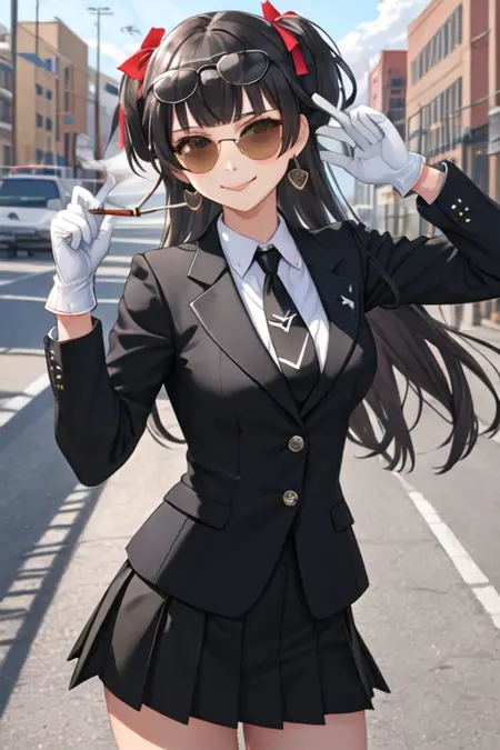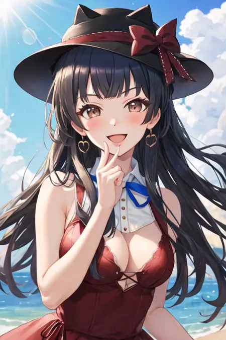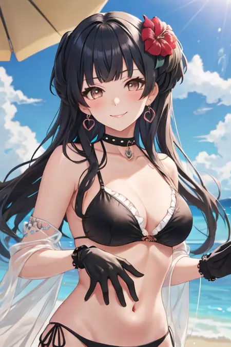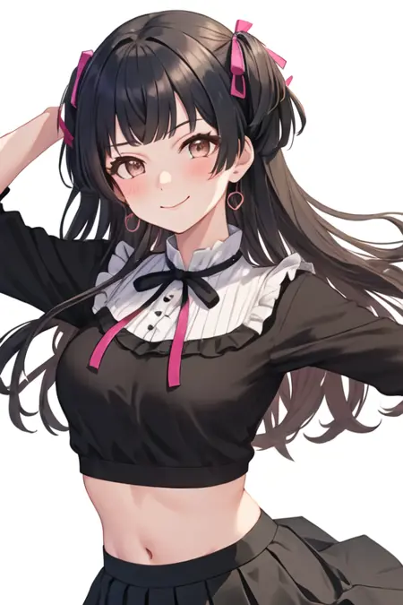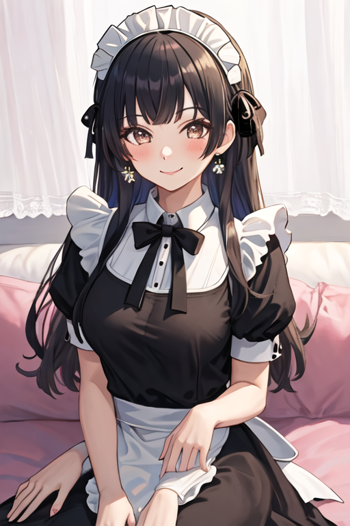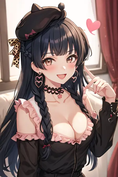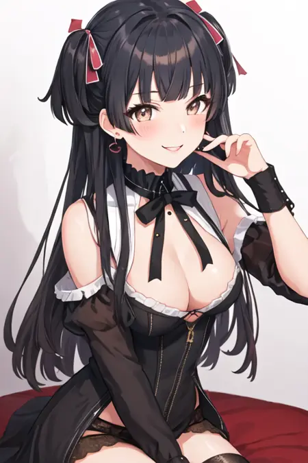 The trigger word is mayuzumi_fuyuko_theidolmstershinycolors, and the recommended tags are best quality, masterpiece, highres, solo, {mayuzumi_fuyuko_theidolmstershinycolors:1.15}, black_hair, bangs, long_hair, blush, brown_eyes, blunt_bangs, breasts, two_side_up, smile, ribbon, medium_breasts.