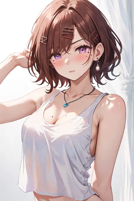 トリガー語はhiguchi_madoka_theidolmstershinycolors、推奨タグはbest quality, masterpiece, highres, solo, {higuchi_madoka_theidolmstershinycolors:1.15}, short_hair, brown_hair, mole, mole_under_eye, bangs, hair_ornament, hairclip, purple_eyes, blush, breastsです。