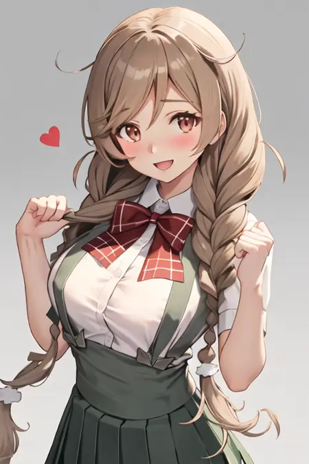 トリガー語はminegumo_kantaicollectionで、推奨タグはbest quality, masterpiece, highres, solo, {minegumo_kantaicollection:1.15}, long_hair, twin_braids, braid, light_brown_hair, red_eyes, breasts, brown_eyes, gradient_hair, multicolored_hair, blush, open_mouth, bow, bowtie, red_bow, smile, red_bowtie, large_breastsです。