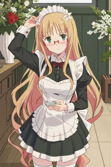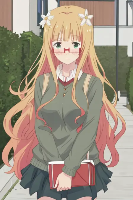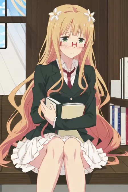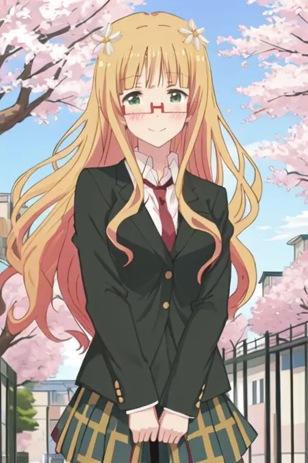 The trigger word is mitsuki_sonoda_sakuratrick, and the recommended tags are best quality, masterpiece, highres, solo, {mitsuki_sonoda_sakuratrick:1.15}, blonde_hair, glasses, flower, blush, hair_flower, hair_ornament, long_hair, green_eyes, red-framed_eyewear.
