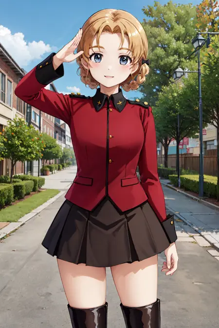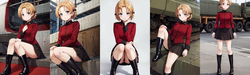 - bbpeko, 단발머리, 땋은 머리, 검은 리본, 갈라진 앞머리, 성 글로리아나 군복, 어깨장식, 빨간 재킷, 긴 소매, 치마, 검은 치마, 부츠, 검은 신발