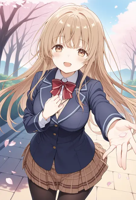 outfit1aamahiru, long hair, brown hair, brown eyes, breasts, school uniform, red bowtie, collared shirt, white shirt, blazer, blue jacket, long sleeves, plaid skirt, brown skirt, black pantyhose