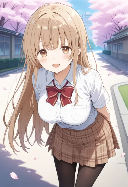 outfit2aamahiru, long hair, brown hair, brown eyes, breasts, school uniform, red bowtie, collared shirt, white shirt, short sleeves, plaid skirt, brown skirt, black pantyhose