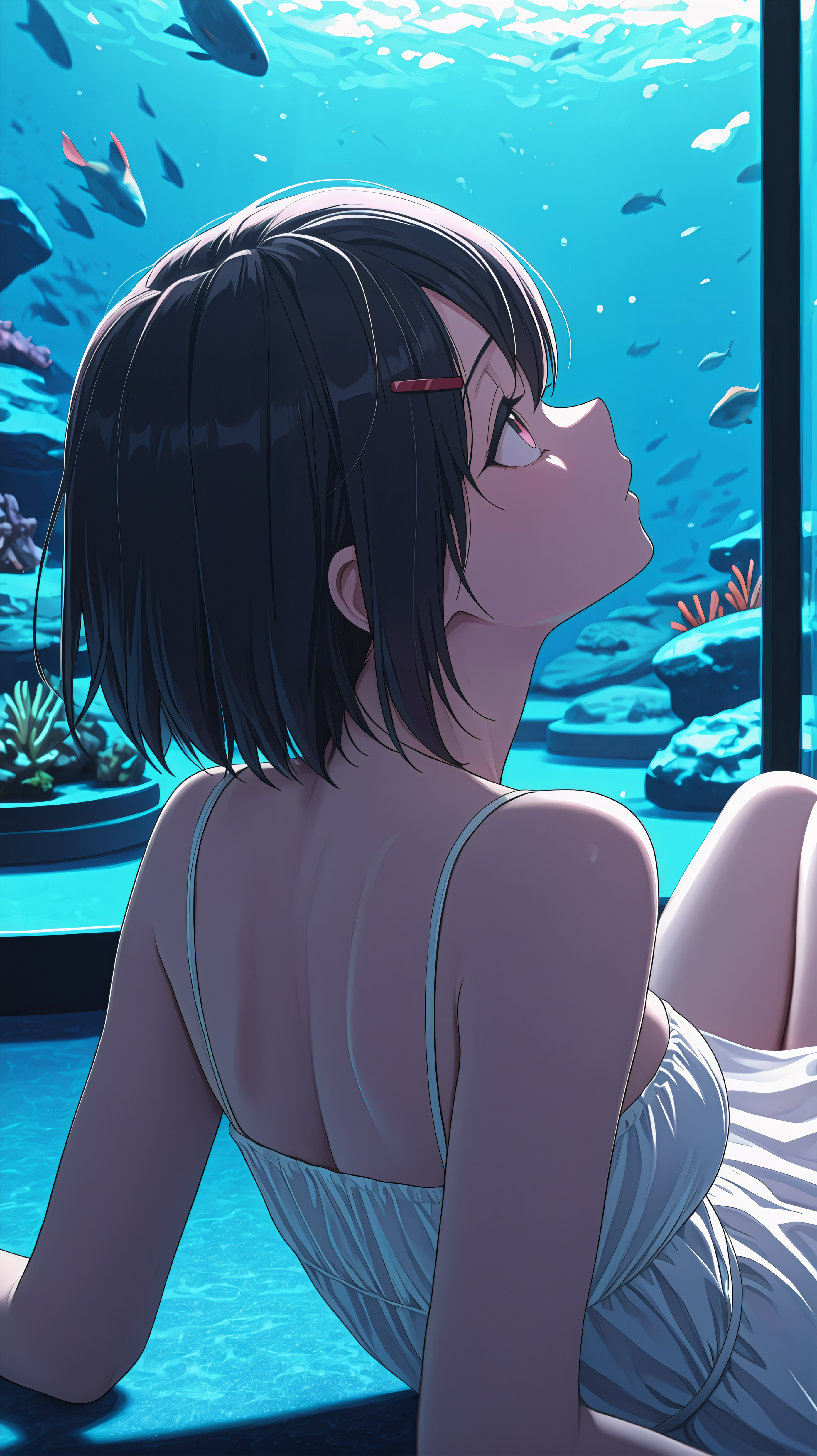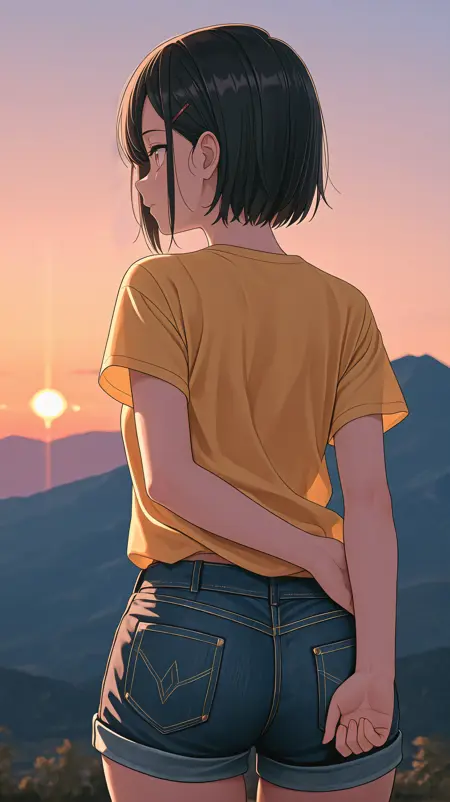 short hair, black hair, pink eyes, pink sports bra, pink shorts, colorful blue jacket, oversized jacket, hairclip, bangs,
