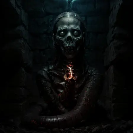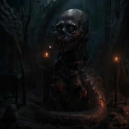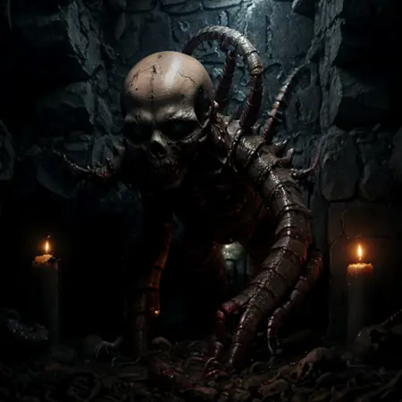 asthikada, bone, book, book stack, cage, candle, candlestand, carapace, crypt, dark, fire, flame, glowing, glowing eyes, hat, indoors, inhuman head, insectoid arms, lamp, looking at viewer, no humans, open mouth, ribs, ruins, scenery, skull, solo, spikes, stairs, standing, stone wall, table, tangled arms, teeth, tentacles, tongue, torch, tree, wall, worm body, yellow eyes,