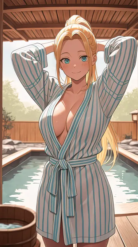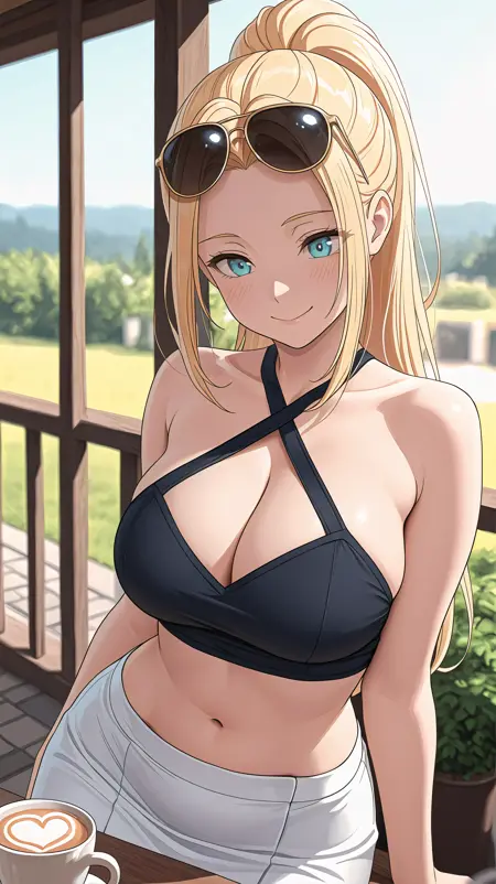 long hair, blonde hair, ponytail, blue eyes, white tank top, red (samurai armor), red gloves, pants, large breasts,
