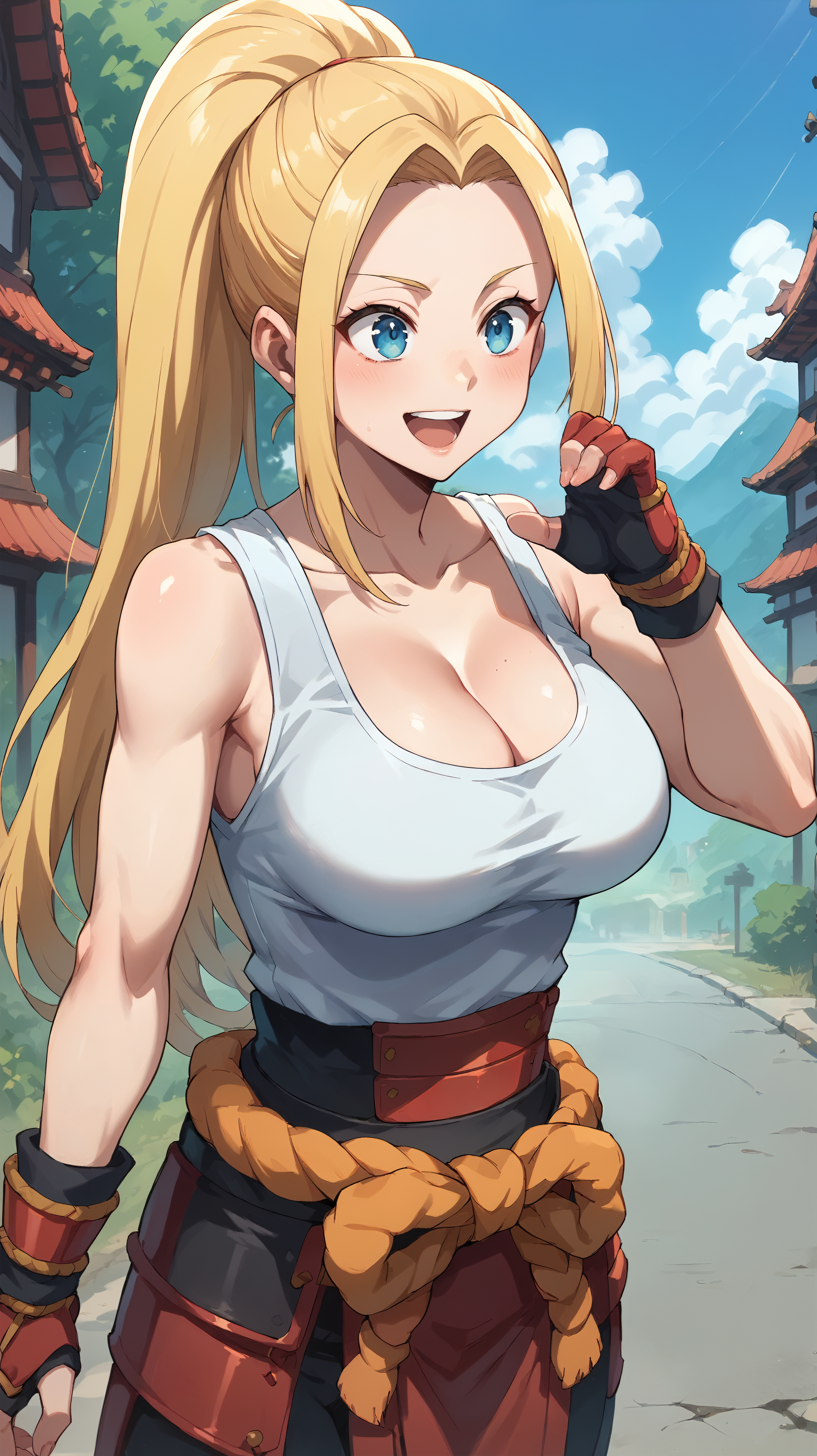 长发,金发,马尾辫,蓝眼睛,白色背心,红色(武士铠甲),红色手套,裤子,大胸,