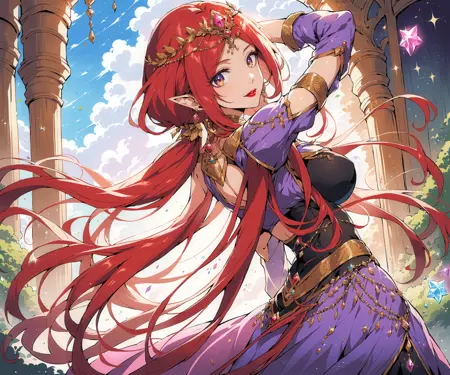 (金髪、ショートヘア、カールヘア、前髪、紫の目、牙(または片牙)、尖った耳)