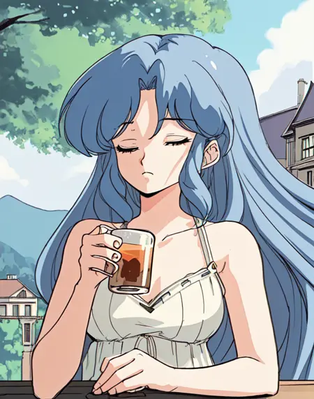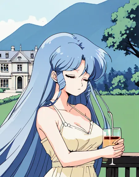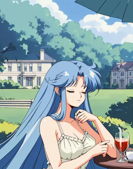 b-ko, 1girl, solo, closed eyes, upper body, blue hair, long hair, curled bangs, cream summer dress, outdoors, drinking tea, mansion in background, 80s theme
