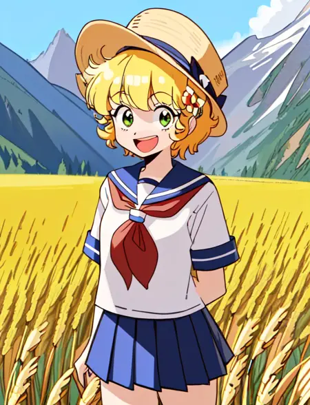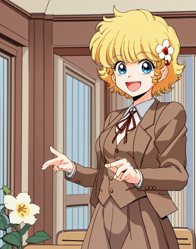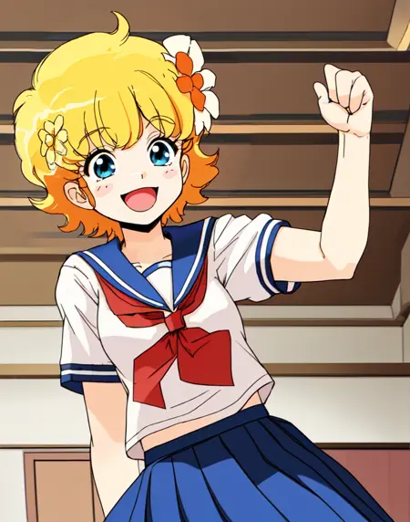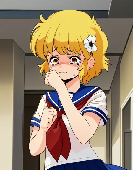 c-ko, 1girl, cute, blonde hair, short hair, flower, upper body, happy, school uniform, blue collar, skirt, short sleeves, indoors at school,sad, tears, crying, clenched fist