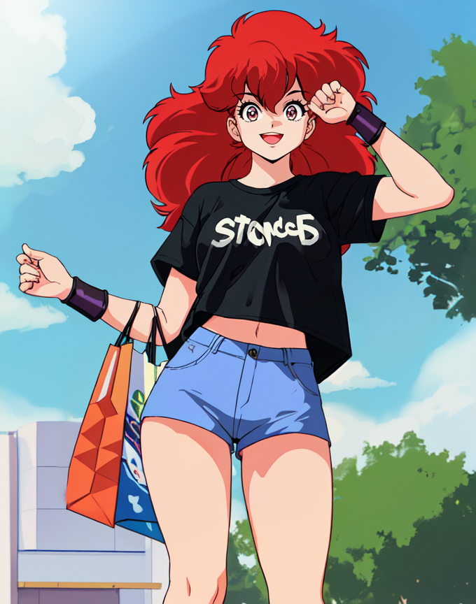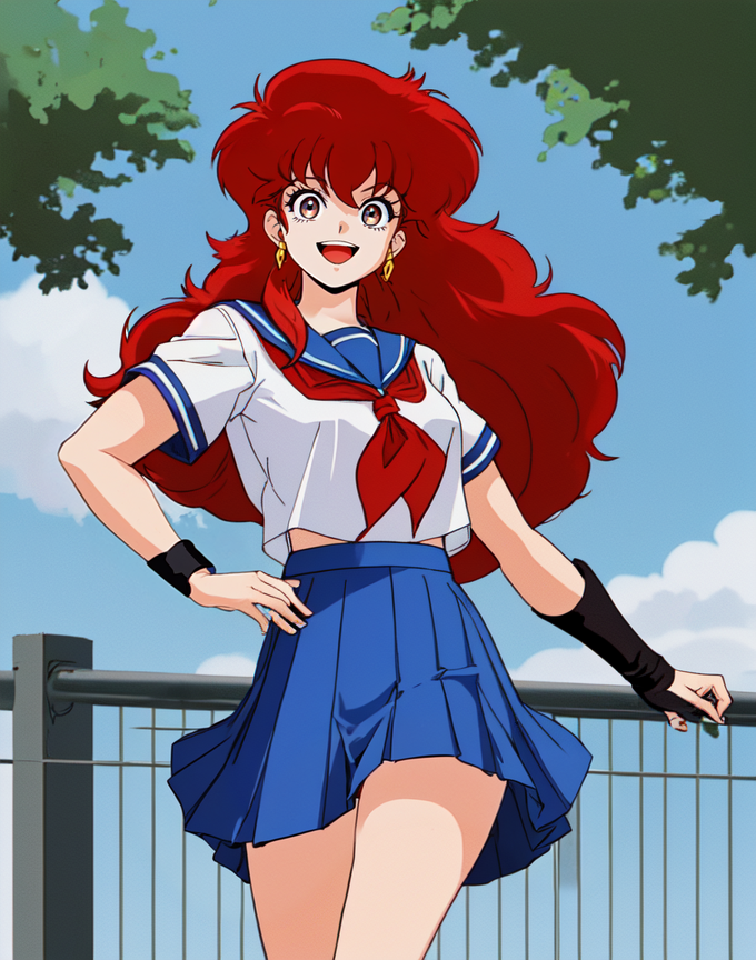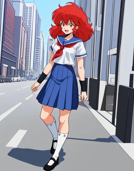 a-ko, 1girl, red medium messy hair, white blouse, short sleeves, blue collar, red neck scarf, long blue skirt, white knee high socks, black bracers, black shoes, happy, outdoors in the city,