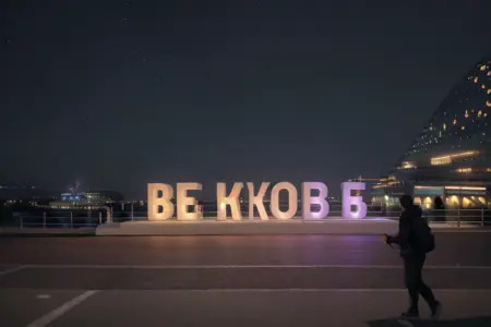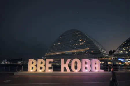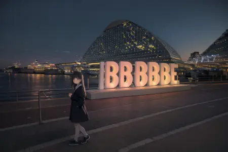 Prompt (Night) : BE_KOBE_monument, night, scenery, building, sky, lights, night sky, outdoors, city, lamppost, cityscape, english text, neon lights, railing, ship