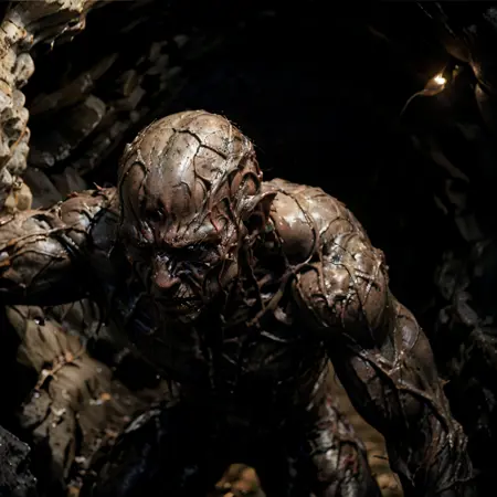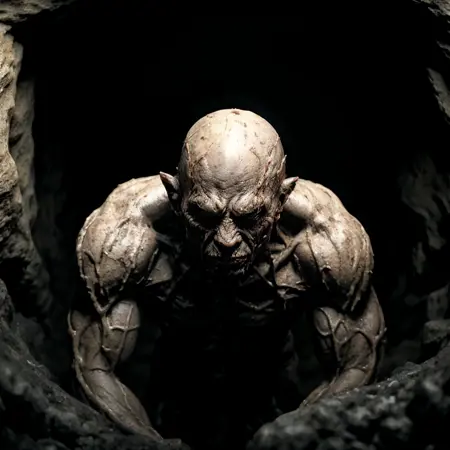 1boy, bald, black background, blood, blurry, blurry background, dripping, emerging from floor, emerging from wall, facial hair, from side, glowing, glowing eyes, gyrgogg, male focus, manly, muscular, no humans, open mouth, outdoors, realistic, red eyes, sharp teeth, shiny, solo, teeth, upper body, veins, water, wet, yellow eyes,