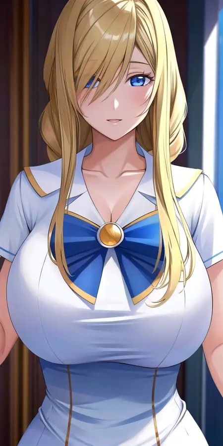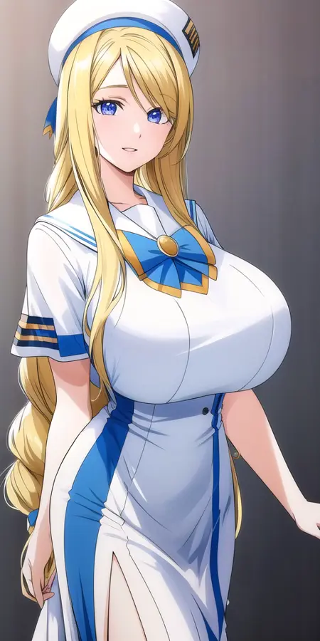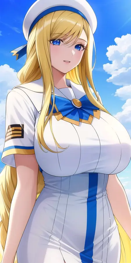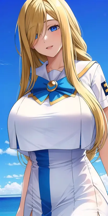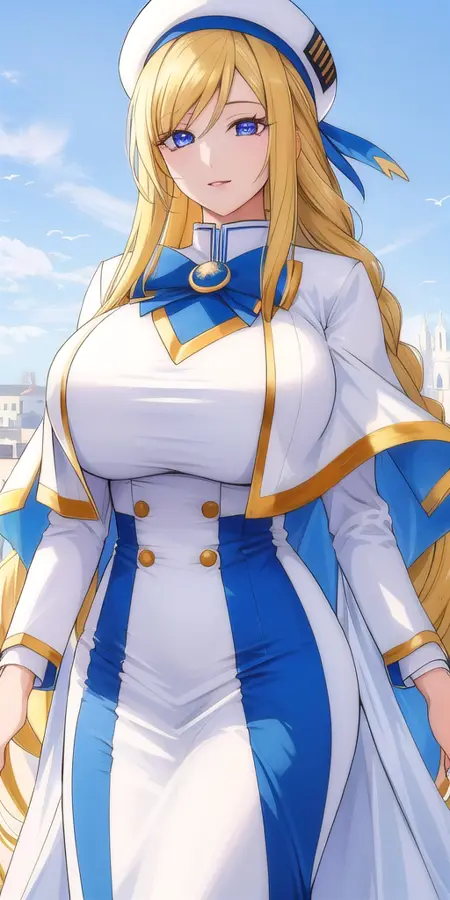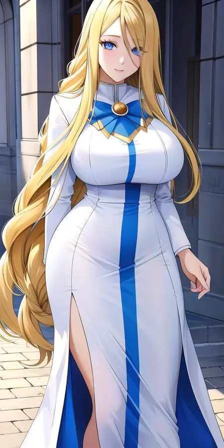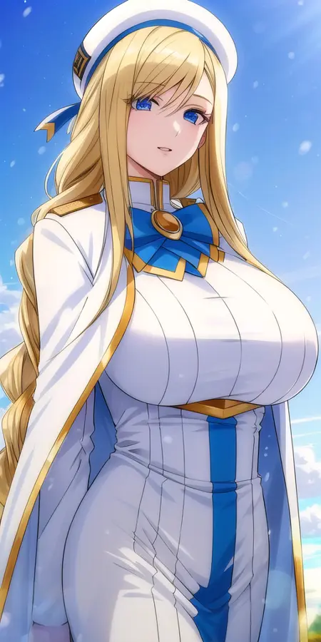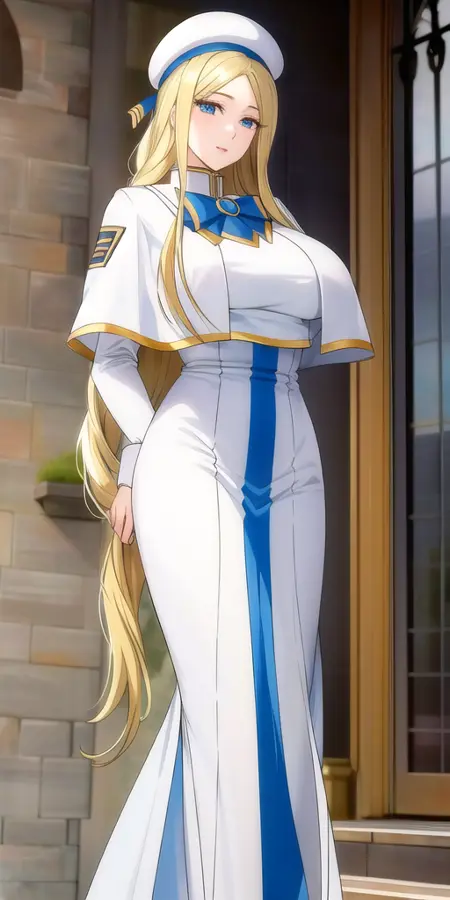 Summer_aria_company_uniform_White_long_dress_White_capelet_Blue_bowtie_Short_sleeves_Side_slit: The summer version of her uniform.