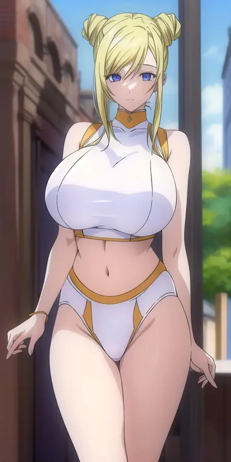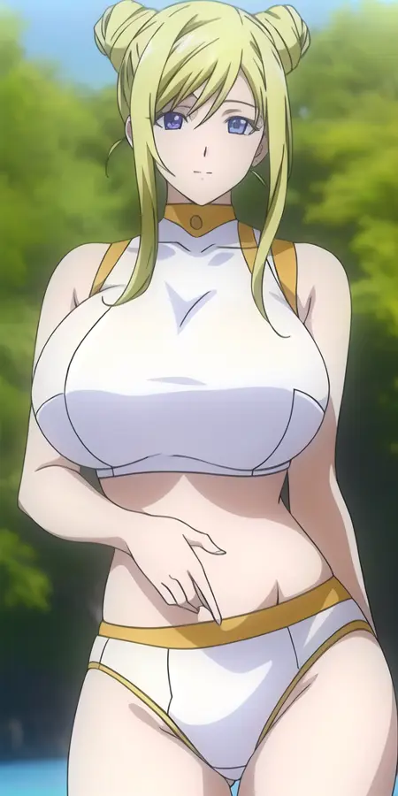 white_tankini_bikini: Her sports bikini from a beach episode, she also wear her hair in twin buns.