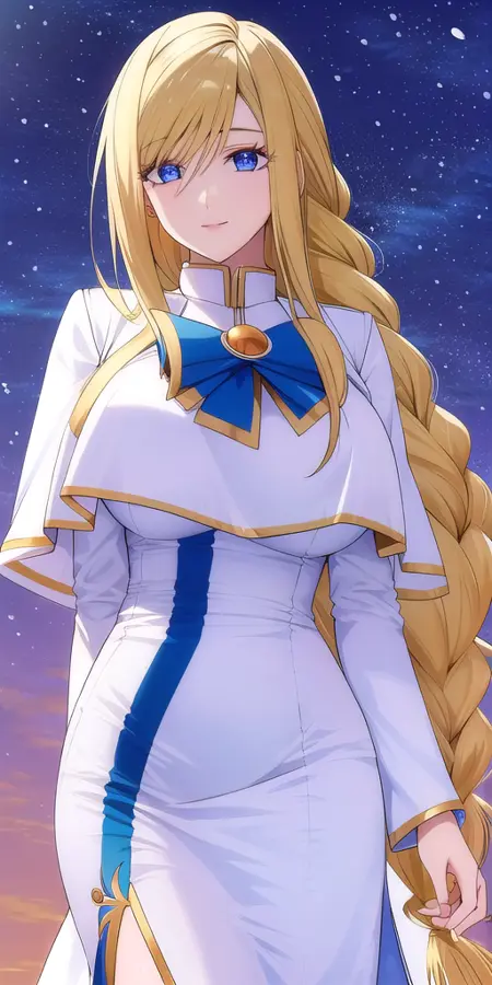 Winter_aria_company_uniform_White_long_dress_White_capelet_Blue_bowtie_Long_sleeves_high_collar_Side_slit: Winter variation of the aria company uniform.