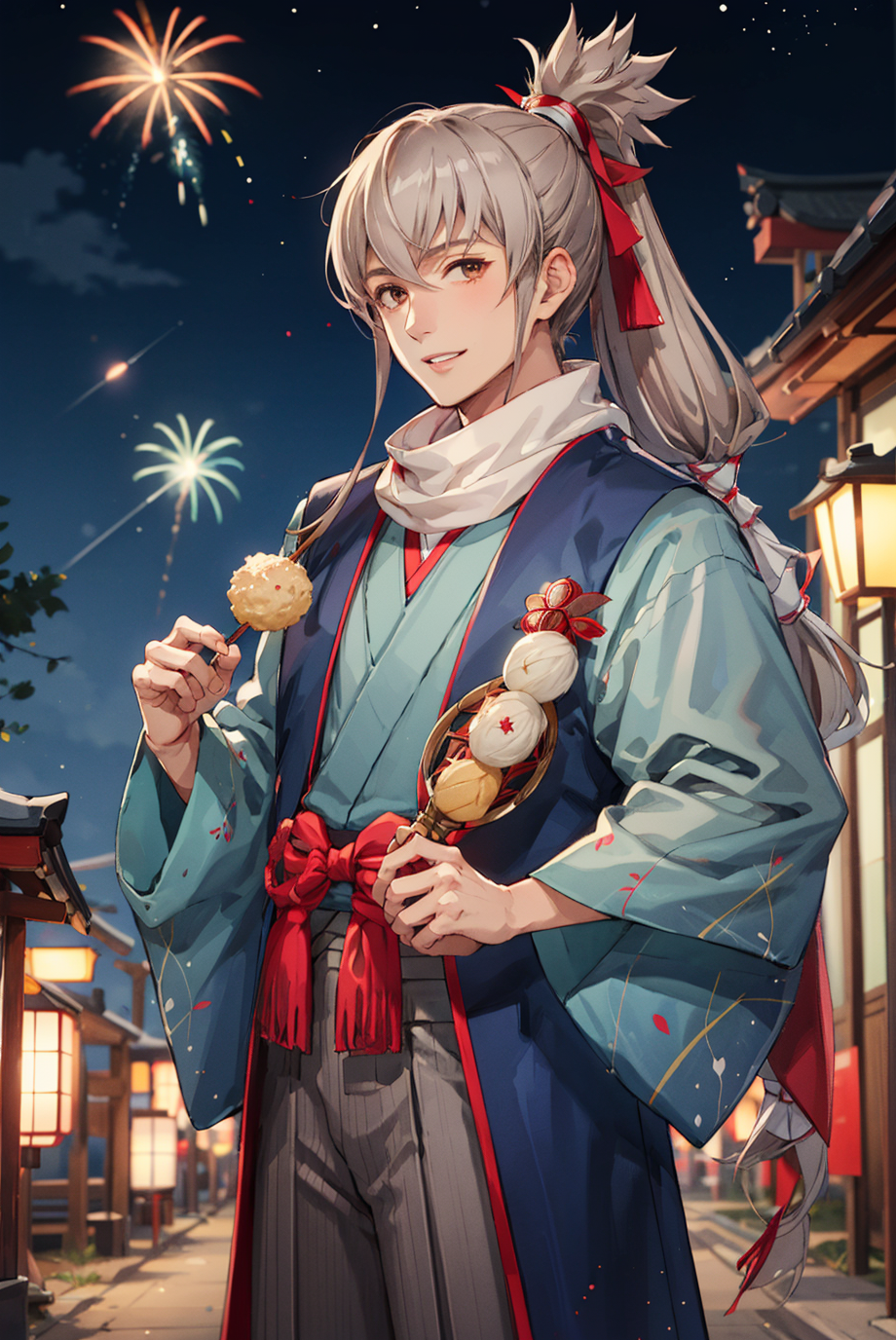 FEH 正月:newTakumi、ポニーテール、長い髪、和服、着物、スカーフ、草履、袴、足袋、和菓子