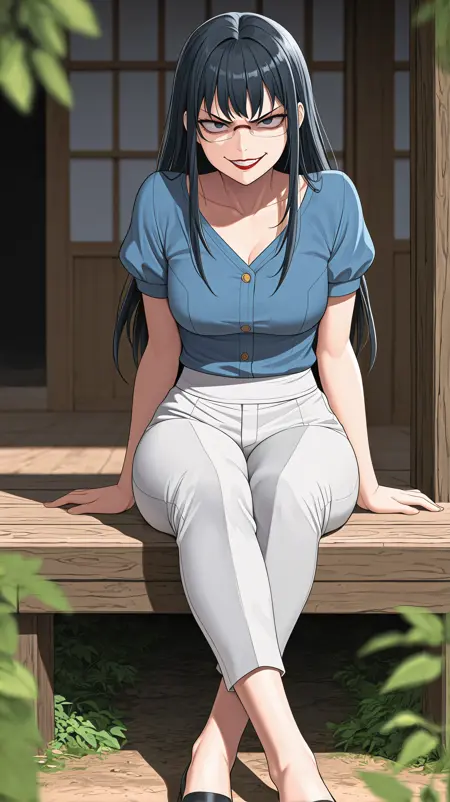 glasses, long hair, black hair, dark blue eyes, blue shirt, white pants, red lipstick, tired eyes, evil smile, angry eyes