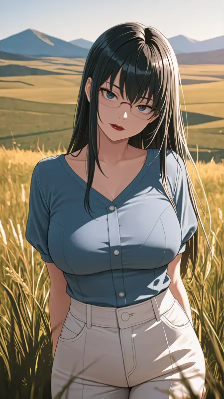glasses, long hair, black hair, dark blue eyes, blue shirt, short sleeves, white pants, red lipstick, tired eyes,
