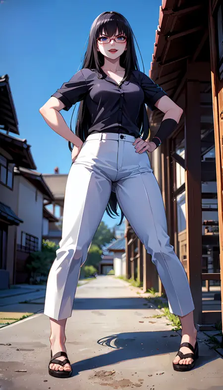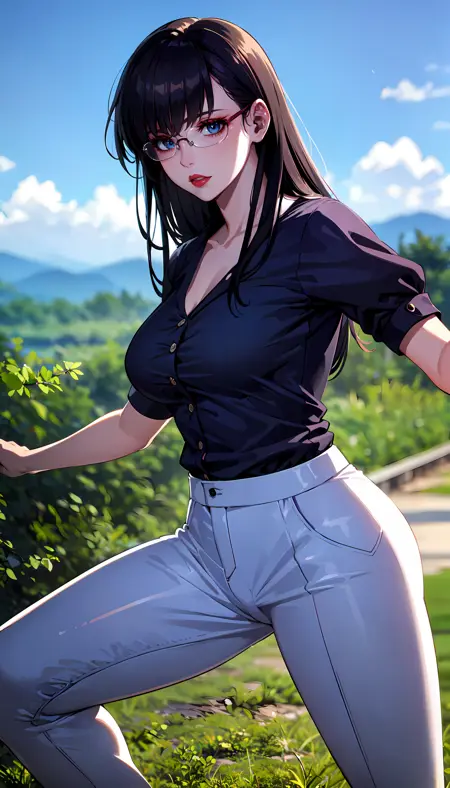 glasses, long hair, black hair, dark blue eyes, blue shirt, white pants, red lipstick, tired eyes, evil smile, angry eyes