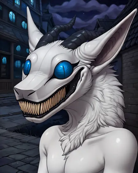 synx, fluffy, white body, toothy grin, black lips, neck tuft, thick tail,