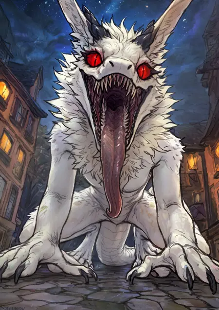 prick ears, 2 horns, black horn, red eyes, slit pupils, black claws