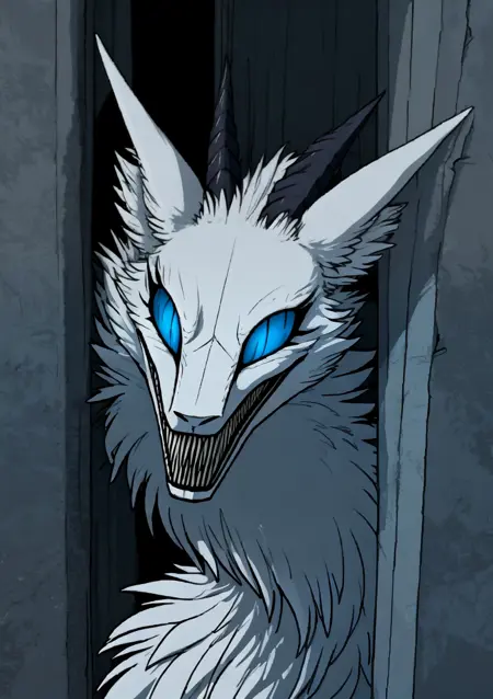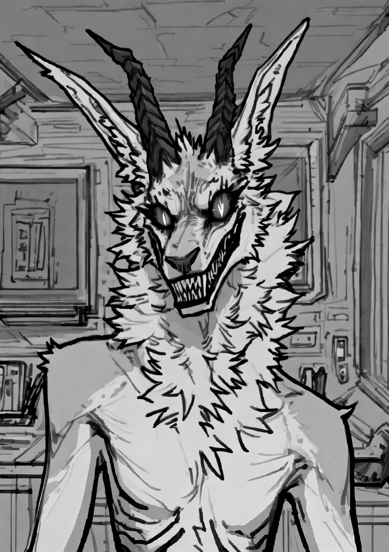 synx, fluffy, white body, toothy grin, black lips, neck tuft, thick tail,