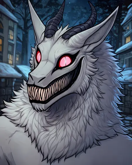 synx, fluffy, white body, toothy grin, black lips, neck tuft, thick tail,