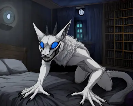 synx, fluffy, white body, toothy grin, black lips, neck tuft, thick tail,