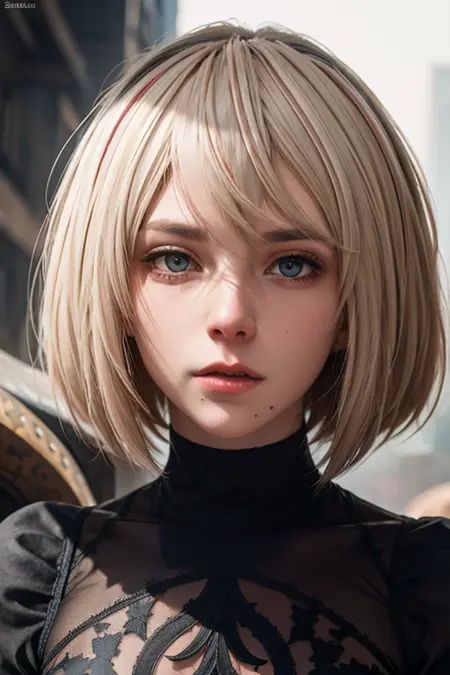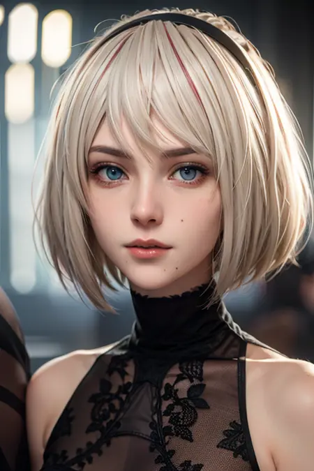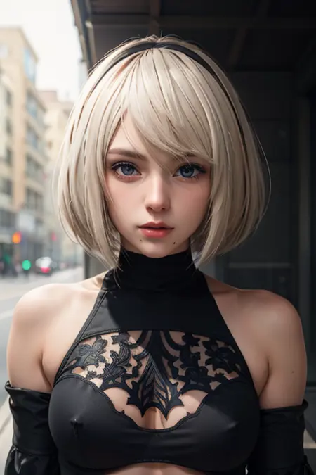 マスタピース、最高品質、2Bレオタード、目を覆った状態、髪で目を隠した、白髪、短髪、黒いヘアバンド、黒い目隠し、黒いドレス、衣装のカットアウト、白いレオタード、手袋、黒い シャツ、ブーツ、観察者を見つめる、手を腰に当てた姿勢