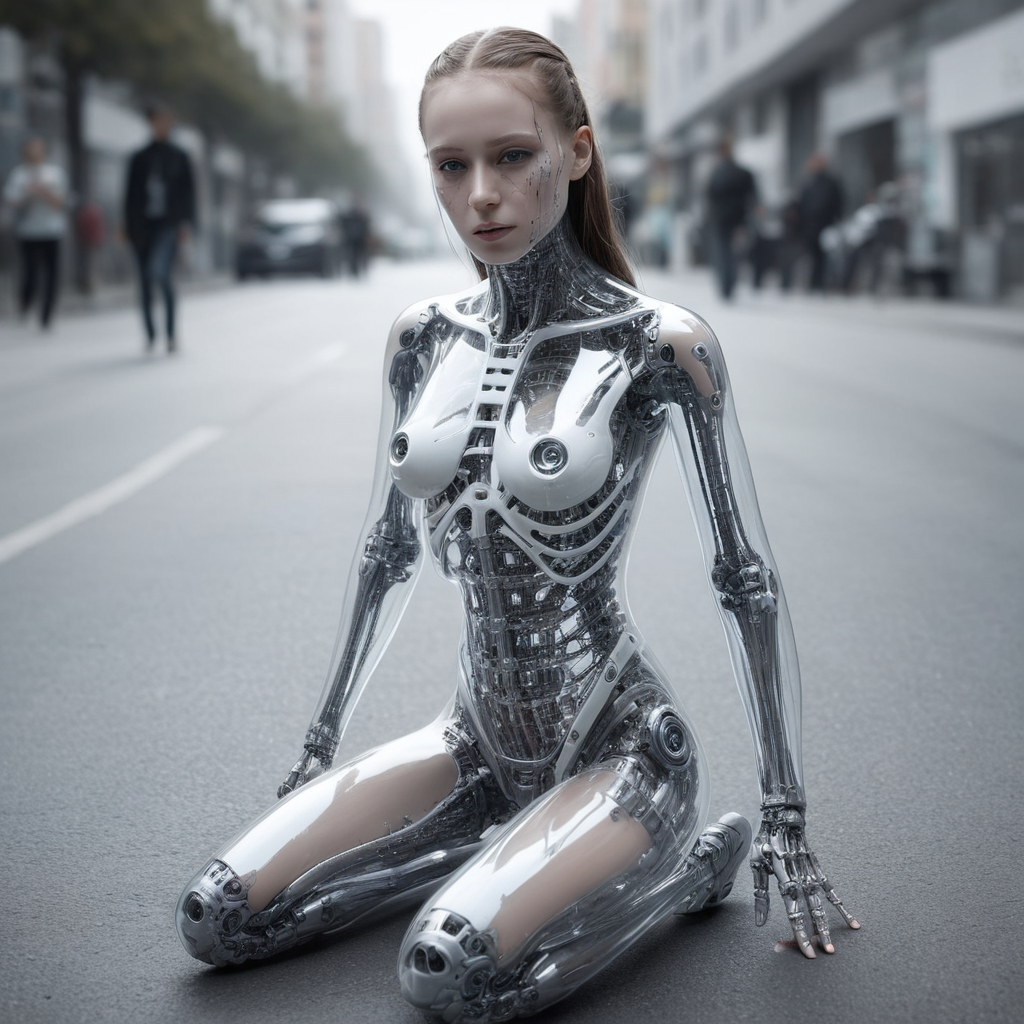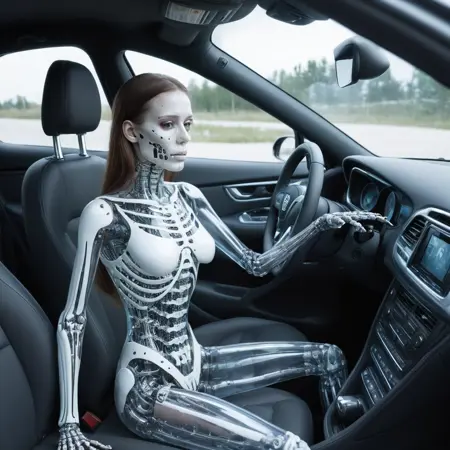 cyborg miss universe with transparent skin, siting in bar, full body, white skeleton, photo, lora:transparent\_cyberdog:1