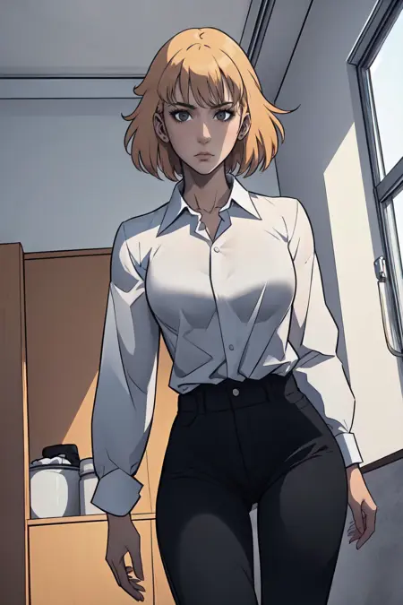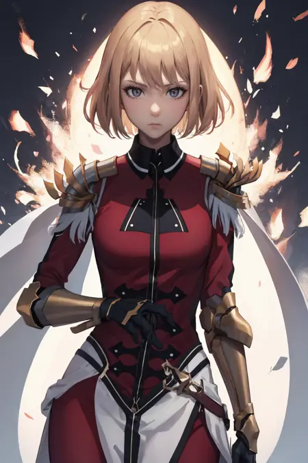 Default Outfit: armor, black collar, shoulder armor, long sleeves, gloves, gauntlets, pelvic curtain