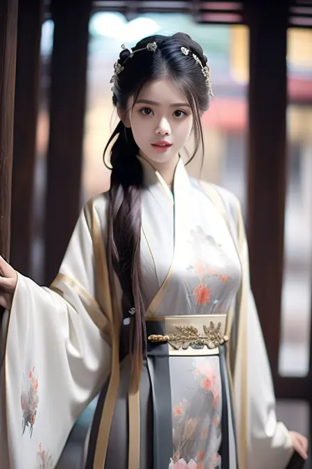 기타 수식어는 자유롭게 선택하여 사용: hanfu, 중국 복장, 넓은 소매, 긴 소매, 띠, 투명, 층층이 입은 옷, 전통 복장,