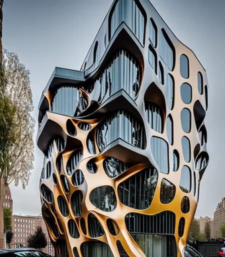 「パラメトリックな建物の写真。Midjourneyi風、波紋、根、血管、多数の窓、通りにある」