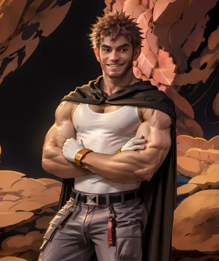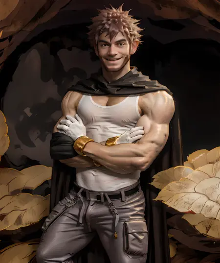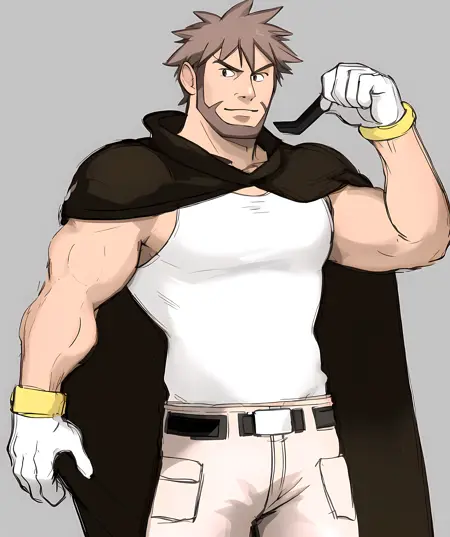 byron_pokemon, long pants, white tank top, white gloves, brown spiky hair, beard, cape