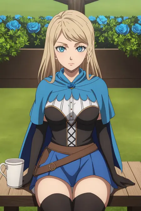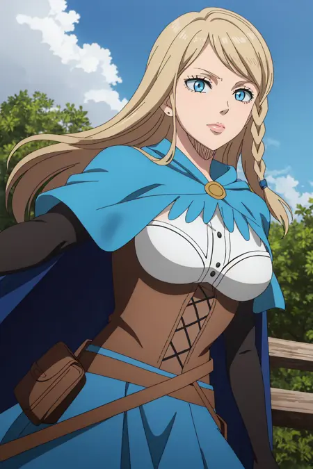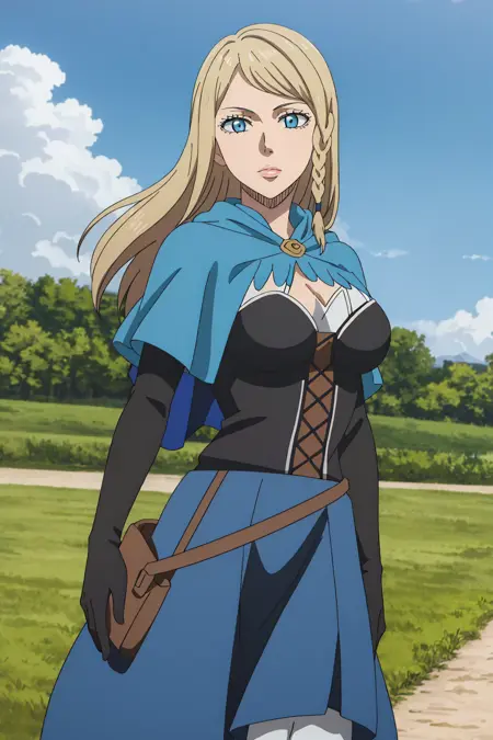 elbow gloves, corset, capelet, blue cape, belt, skirt, cleavage, blue dress, black gloves,