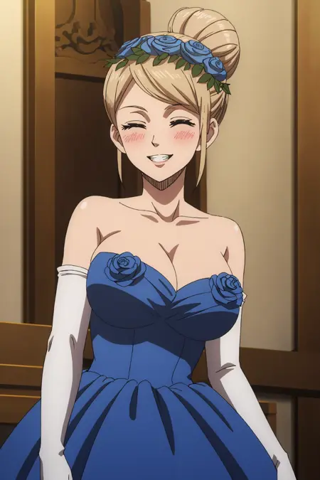 가슴 노출, 어깨 노출, 파란색 꽃, 파란색 드레스, 머리 장식, 머리 꽃, 흰색 장갑, 스트랩리스 드레스, 뒷목뼈, 보석,