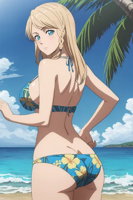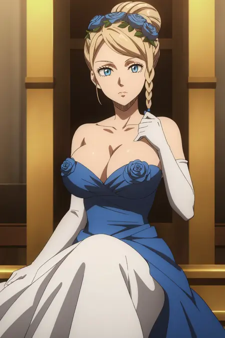 cleavage, bare shoulders, blue flower, blue dress, hair ornament, hair flower, white gloves, strapless dress, collarbone, jewelry,