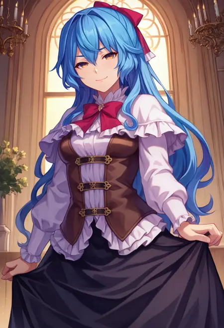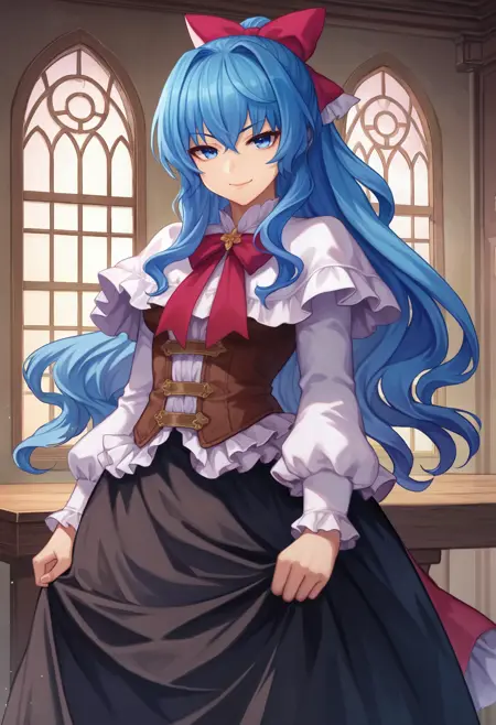 她的日常服装被简化为 default outfit。为提高一致性,可能需要明确指定 发带,黑色裙子。
