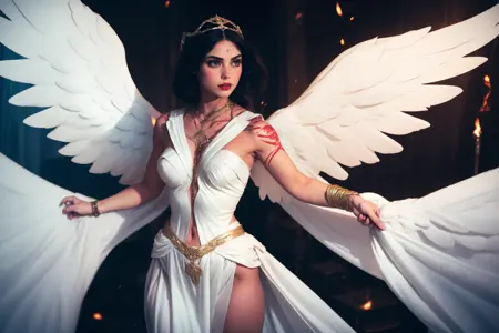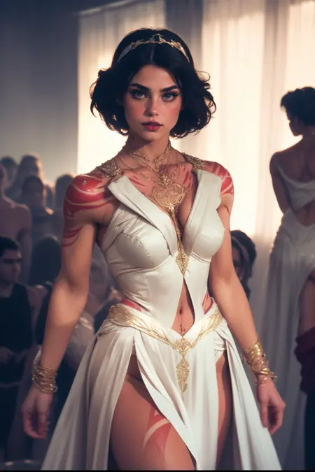 d3j4h, (white harness), tattoo, bracelets, headband, pelvic curtain, white long skirt