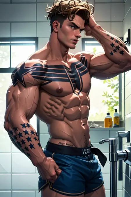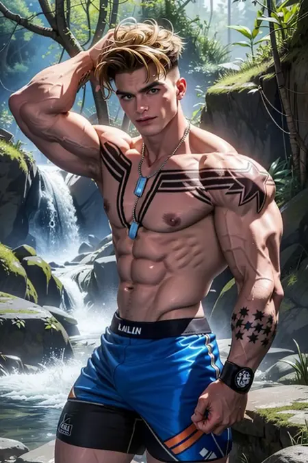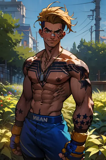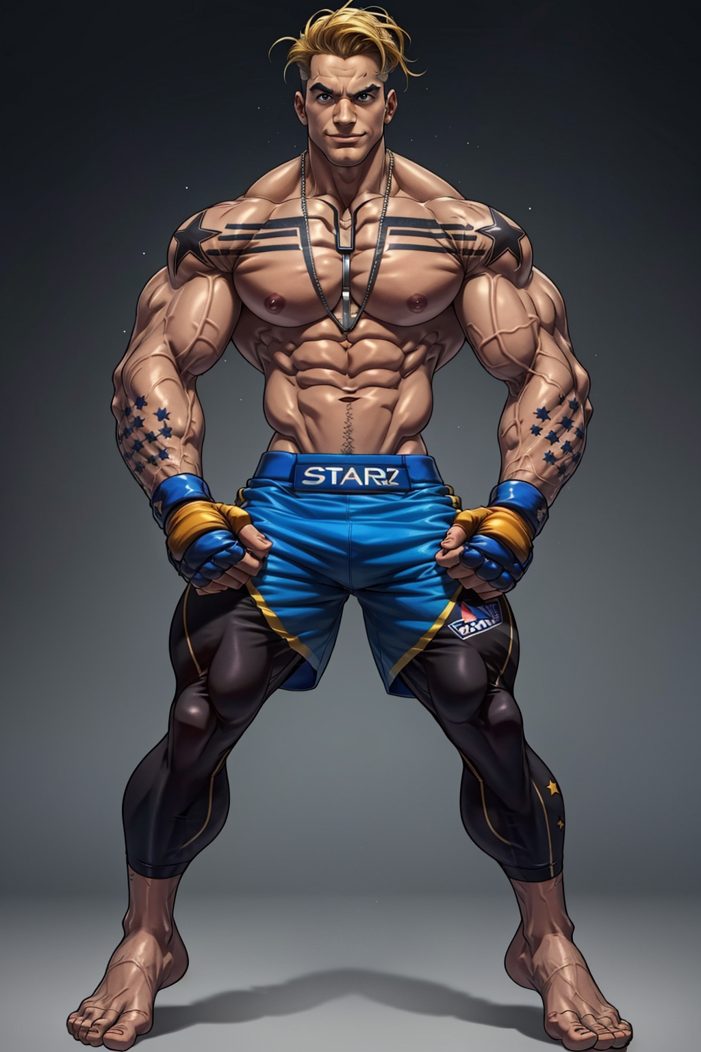 also: bandaid on nose, face scar, necklace, tattoo, star tattoos, fighting gloves, boxing shorts, leggings,