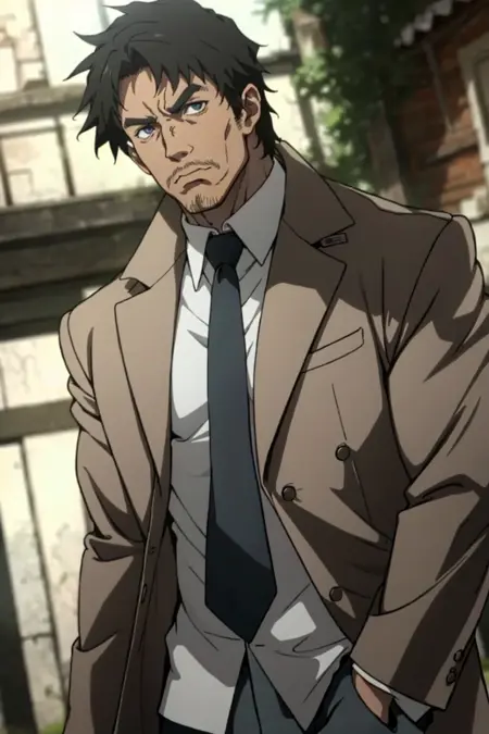 Prompt: sBlitz T. Abrams, black hair, short hair, sideburns, grey-blue eyes, facial hair, stubble, white collared shirt, black necktie, beige overcoat, long overcoat, closed overcoat, buttoned overcoat, grey pants, black shoes